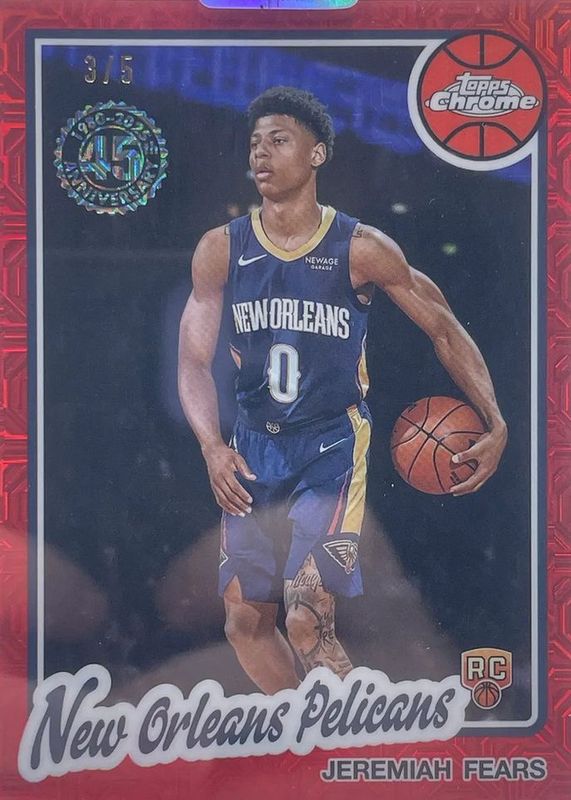 The Jeremiah Fears 2025 Topps Silver Pack #TC-JF 1980-81 Topps Chrome - Red Refractor /5 Rookie card in Raw condition has not changed in price in the last 30 days and was last sold for $450.00 .