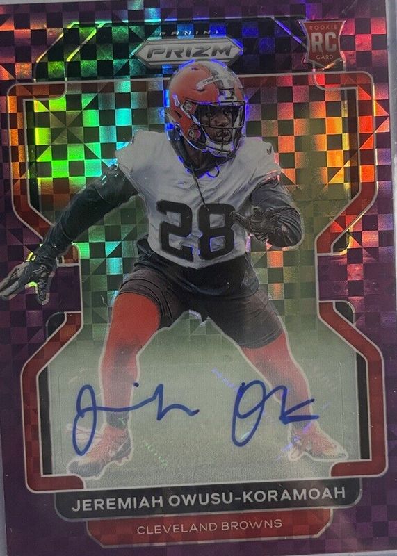 The Jeremiah Owusu-Koramoah 2021 Prizm #389 Rookie Autographs - Purple Power /49 card in Raw condition has not changed in price in the last 30 days and was last sold for $30.00 .
