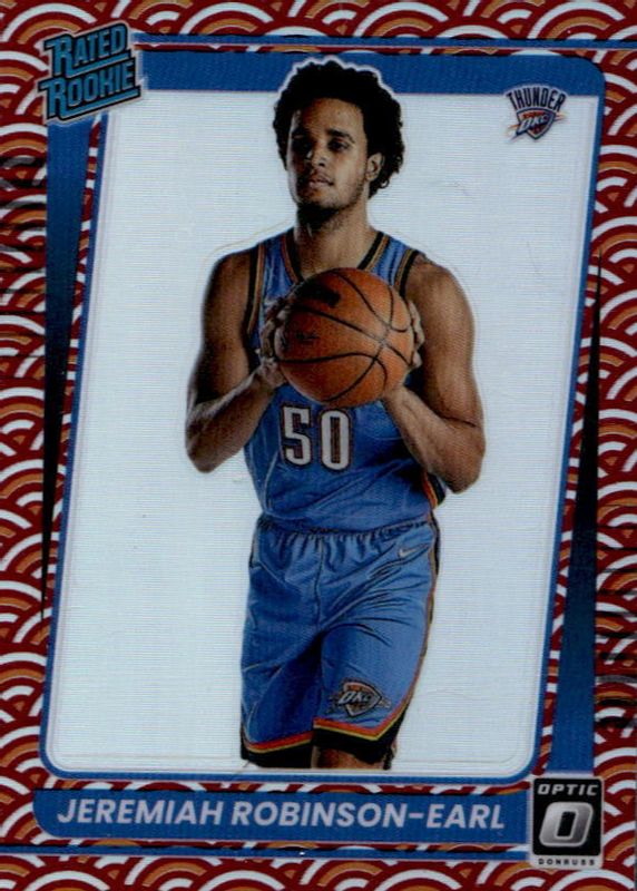 This card is 1 of 43 Jeremiah Robinson-Earl's card variations in the 2021 Optic set being tracked by Sports Card Investor, including Base, Blue Pulsar, Blue Velocity, Checkerboard, and Choice Red & Green.