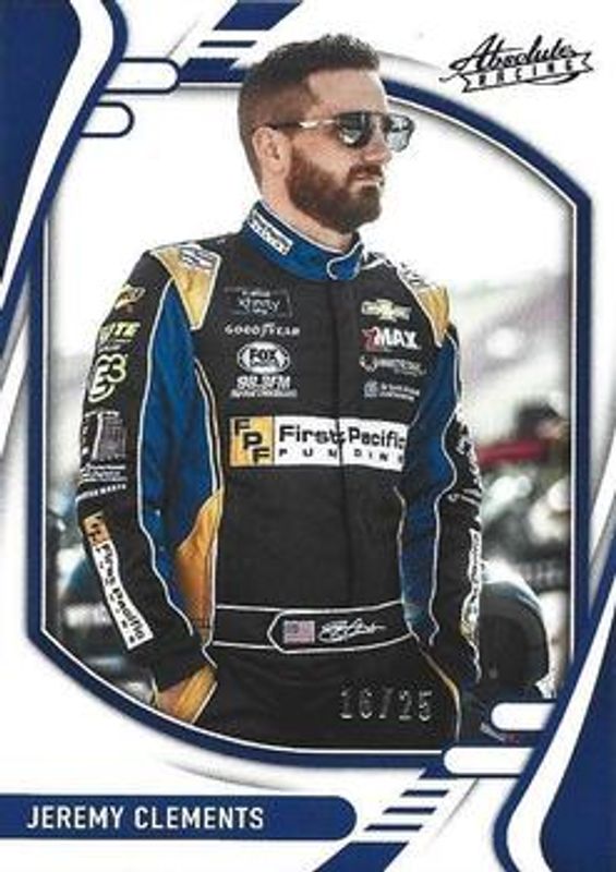 The Jeremy Clements 2022 Chronicles NASCAR #8 Absolute Purple /25 card is 1 of 18 Jeremy Clements' card variations in the 2022 Chronicles NASCAR set being tracked by Sports Card Investor, including Absolute, Absolute Autographs, Absolute Blue /199, Absolute Red /99, and Absolute Autographs Purple /10.