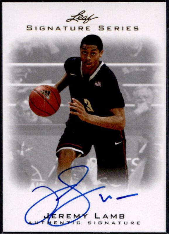 The Jeremy Lamb 2012 Leaf Signature Series #BA-JL1 Base Rookie card is 1 of 37 Jeremy Lamb's card variations in the 2012 Leaf Signature Series set being tracked by Sports Card Investor, including Silver /99, Gold /25, Blue /10, Red /5, and Printing Plates Black /1.