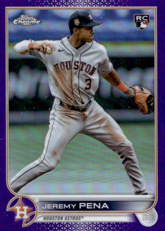Jeremy Pena's Baseball cards are available in at least 59 sets. Jeremy Pena's biggest 7-day price movers are 2020 Bowman #BP-61 Paper Prospects (1st), 2022 Topps Update #US253 Base, and 2022 Topps Chrome Update #USC136 Purple Refractor.