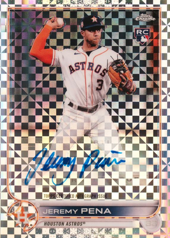 The Jeremy Pena 2022 Topps Chrome Update #AC-JP Autographs - X-Fractor /125 Rookie card in Raw condition has not changed in price in the last 30 days and was last sold for $100.00 .