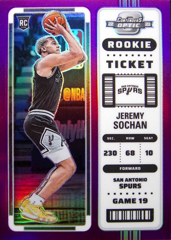 The Jeremy Sochan 2022 Contenders Optic #3 Purple /15 Rookie card in Raw condition has not changed in price in the last 30 days and was last sold for $16.50 .