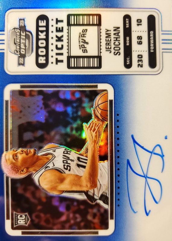 The Jeremy Sochan 2022 Contenders Optic #138 Rookie Ticket Auto Variation - Blue /49 card in Raw condition has not changed in price in the last 30 days and was last sold for $39.00 .