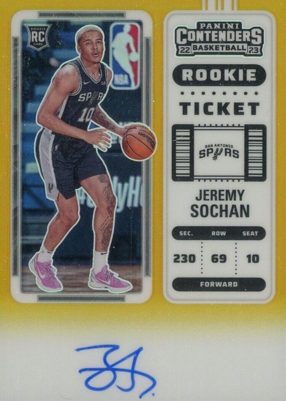 The Jeremy Sochan 2022 Contenders #123 Rookie Ticket Auto - Premium Gold /10 card in Raw condition has not changed in price in the last 30 days.