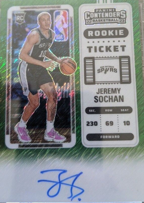The Jeremy Sochan 2022 Contenders #123 Rookie Ticket Auto - Premium Green Shimmer card in Raw condition has not changed in price in the last 30 days and was last sold for $182.50 .