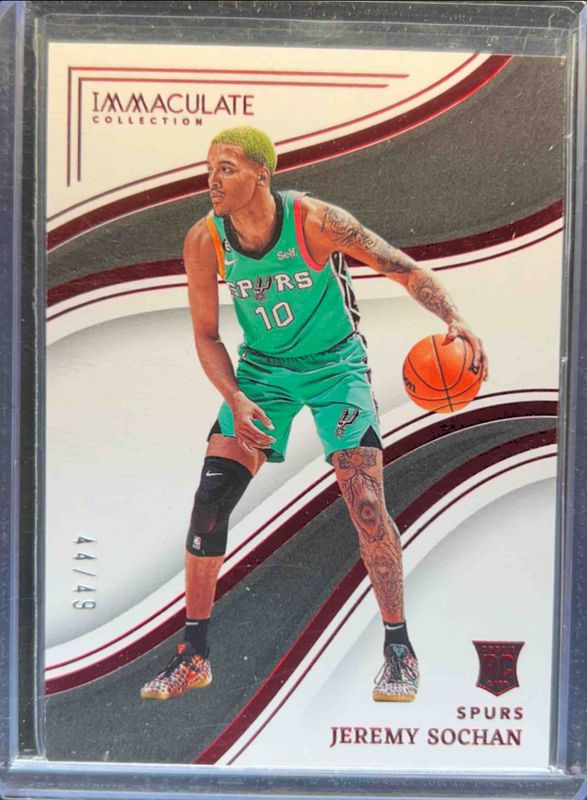 The Jeremy Sochan 2022 Immaculate #47 Red /49 Rookie card is 1 of 36 Jeremy Sochan's card variations in the 2022 Immaculate set being tracked by Sports Card Investor, including #47 Base /99, #130 Base /99, #130 Red /49, #47 Blue /25, and #130 Gold /10.