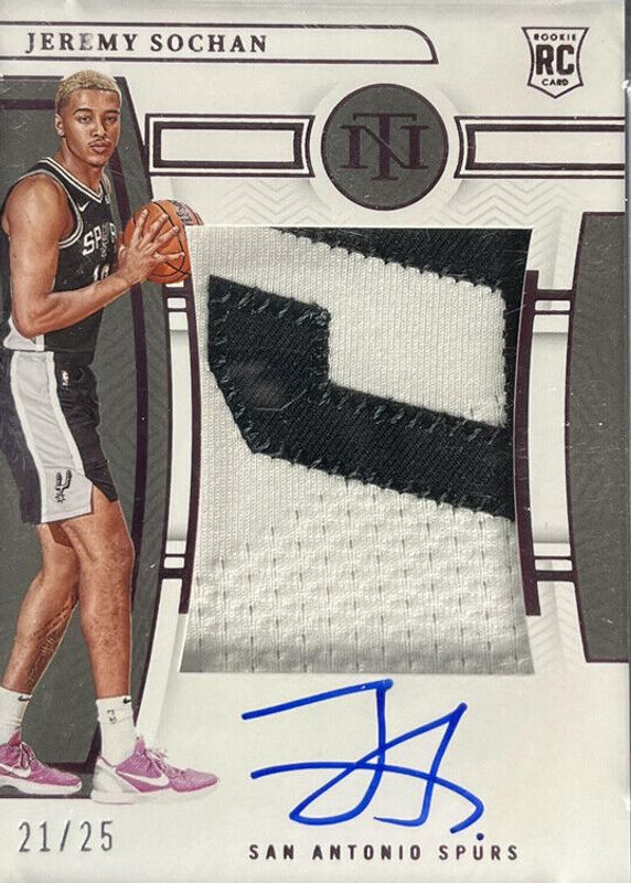 This card is 1 of 10 Jeremy Sochan's card variations in the 2022 National Treasures set being tracked by Sports Card Investor, including Rookie Patch Auto /99, Rookie Patch Auto - Red /75, Rookie Patch Auto - Bronze /49, Rookie Patch Auto - Gold FOTL /24, and Rookie Patch Auto - Gold /10.