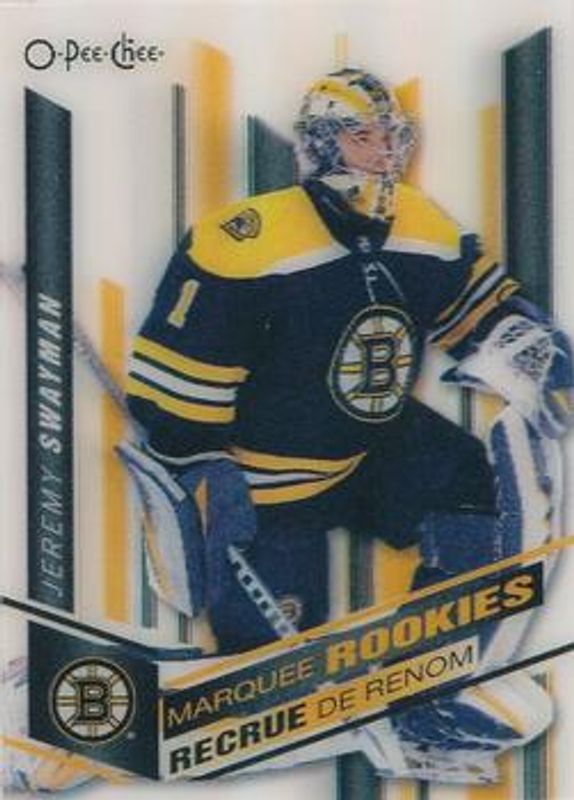 The Jeremy Swayman 2021 O-Pee-Chee #3D-JS 3 D Marquee Rookies card is 1 of 19 Jeremy Swayman's card variations in the 2021 O-Pee-Chee set being tracked by Sports Card Investor, including #525b Base, #525 Base, #525 Blue Border, #525 Red Border, and #525 Retro.