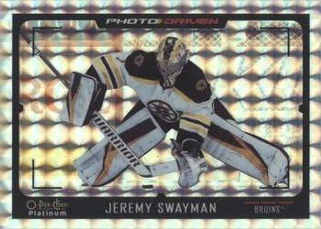 The Jeremy Swayman 2021 O-Pee-Chee Platinum #PD-15 Photo Driven Mosaic Rookie card is 1 of 46 Jeremy Swayman's card variations in the 2021 O-Pee-Chee Platinum set being tracked by Sports Card Investor, including Base, Black Shield (Marquee Rookies), Blue Surge, Matte Pink, and Neon Yellow Surge.