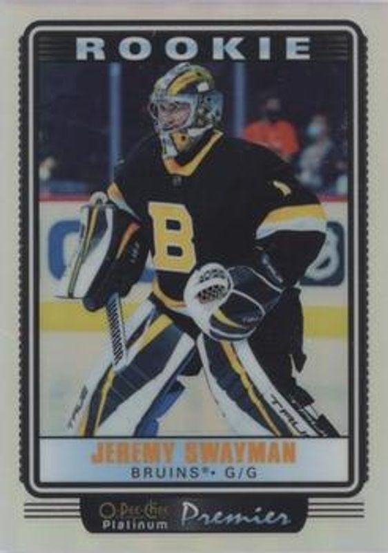 The Jeremy Swayman 2021 O-Pee-Chee Platinum #OP40 Premier Rookie card is 1 of 46 Jeremy Swayman's card variations in the 2021 O-Pee-Chee Platinum set being tracked by Sports Card Investor, including Base, Black Shield (Marquee Rookies), Blue Surge, Matte Pink, and Neon Yellow Surge.