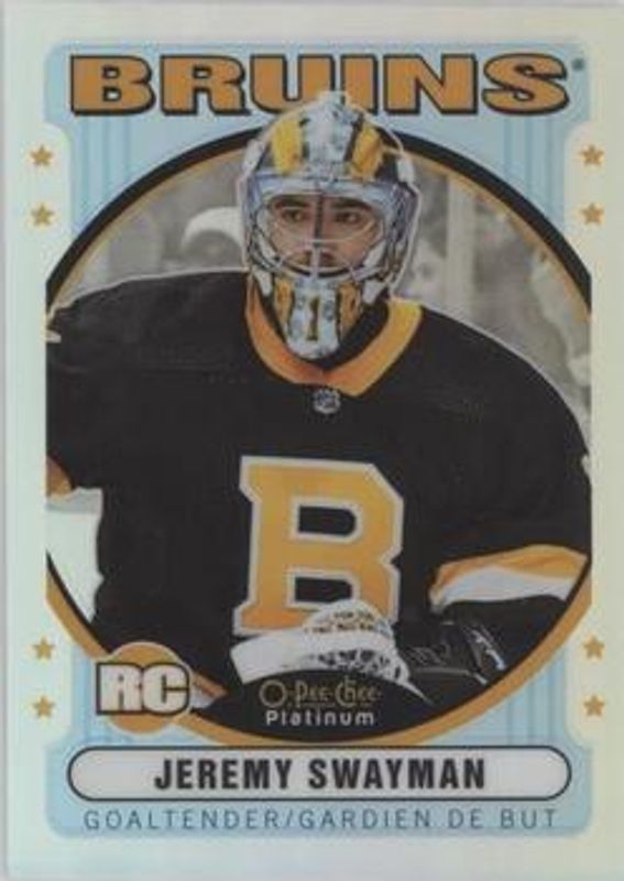 The Jeremy Swayman 2021 O-Pee-Chee Platinum #R-70 Retro Rainbow Rookie card is 1 of 46 Jeremy Swayman's card variations in the 2021 O-Pee-Chee Platinum set being tracked by Sports Card Investor, including Base, Black Shield (Marquee Rookies), Blue Surge, Matte Pink, and Neon Yellow Surge.
