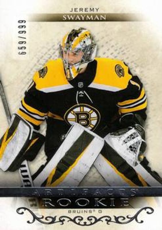 The Jeremy Swayman 2021 Upper Deck Artifacts #163 Base /999 Rookie card is 1 of 36 Jeremy Swayman's card variations in the 2021 Upper Deck Artifacts set being tracked by Sports Card Investor, including Neon Green, Rose Gold, Turquoise, Ruby /499, and Silver Spectrum /299.