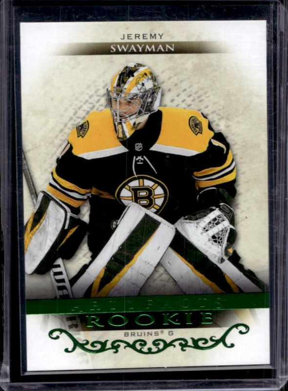 The Jeremy Swayman 2021 Upper Deck Artifacts #163 Neon Green Rookie card is 1 of 36 Jeremy Swayman's card variations in the 2021 Upper Deck Artifacts set being tracked by Sports Card Investor, including Base /999, Rose Gold, Turquoise, Ruby /499, and Silver Spectrum /299.