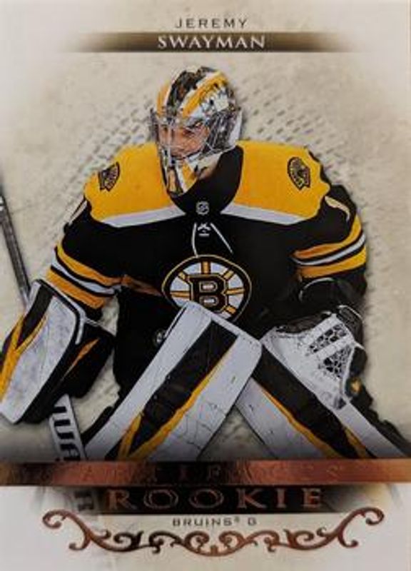 The Jeremy Swayman 2021 Upper Deck Artifacts #163 Rose Gold Rookie card is 1 of 36 Jeremy Swayman's card variations in the 2021 Upper Deck Artifacts set being tracked by Sports Card Investor, including Base /999, Neon Green, Turquoise, Ruby /499, and Silver Spectrum /299.