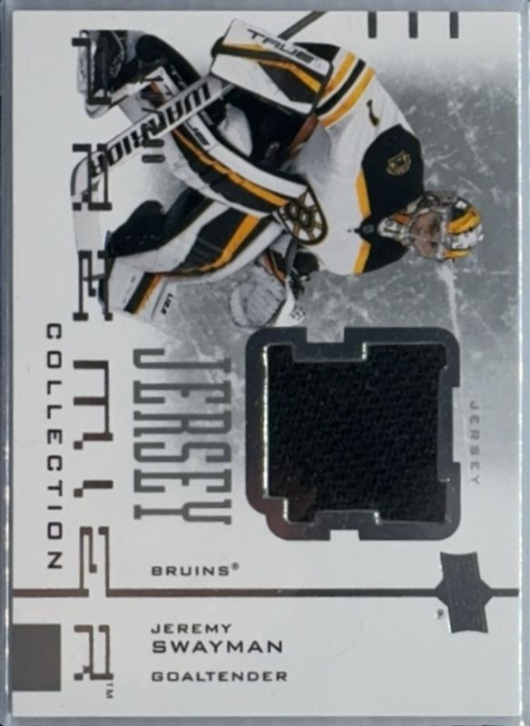 The Jeremy Swayman 2021 Upper Deck Premier #AJ-JS 20th Anniversary - Jersey /300 Rookie card is 1 of 35 Jeremy Swayman's card variations in the 2021 Upper Deck Premier set being tracked by Sports Card Investor, including Base /399, Gold /199, Bronze /65, Purple /10, and Platinum /1.