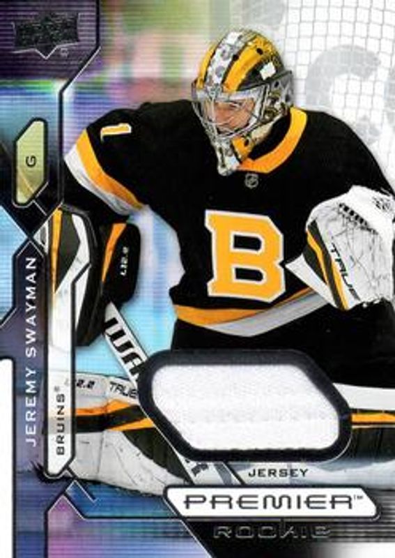 The Jeremy Swayman 2021 Upper Deck Premier #107 Jersey Rookie card is 1 of 35 Jeremy Swayman's card variations in the 2021 Upper Deck Premier set being tracked by Sports Card Investor, including Base /399, Gold /199, Bronze /65, Purple /10, and Platinum /1.