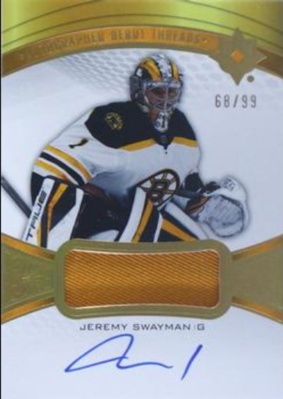 The Jeremy Swayman 2021 Upper Deck Ultimate Collection #ADT-JS Debut Threads /99 Rookie card is 1 of 41 Jeremy Swayman's card variations in the 2021 Upper Deck Ultimate Collection set being tracked by Sports Card Investor, including Base /299, 2000 Ultimate Signatures Retro, 2000 Ultimate Signatures Retro Rookies, Signatures Masterpieces, and Ultimate Emblems - Auto.