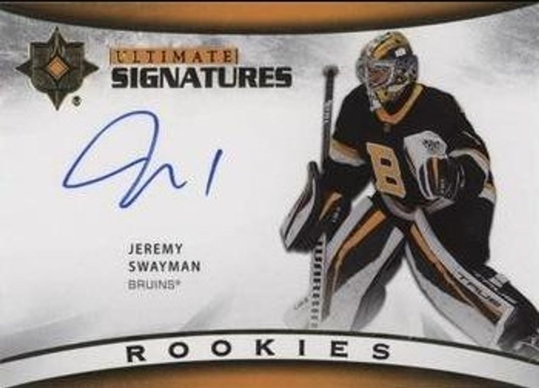 The Jeremy Swayman 2021 Upper Deck Ultimate Collection #USR-JS Ultimate Signatures Rookies card is 1 of 41 Jeremy Swayman's card variations in the 2021 Upper Deck Ultimate Collection set being tracked by Sports Card Investor, including Base /299, 2000 Ultimate Signatures Retro, 2000 Ultimate Signatures Retro Rookies, Signatures Masterpieces, and Ultimate Emblems - Auto.