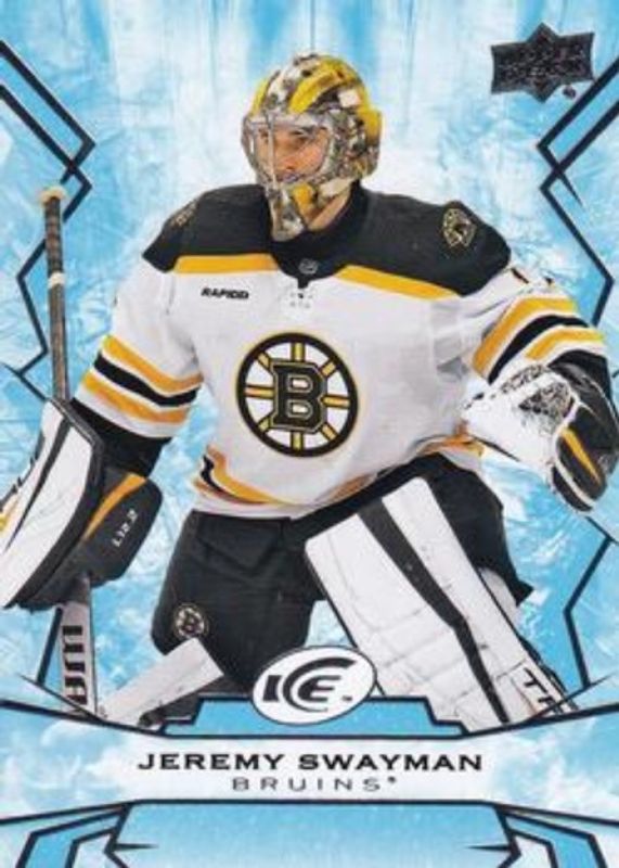 The Jeremy Swayman 2022 Upper Deck Ice #21 Base /1299 card is 1 of 12 Jeremy Swayman's card variations in the 2022 Upper Deck Ice set being tracked by Sports Card Investor, including Autographs White Snowflake, Gold, Green, Ice Blue, and Jersey.