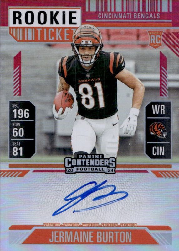 This card is 1 of 27 Jermaine Burton's card variations in the 2024 Contenders set being tracked by Sports Card Investor, including Rookie Ticket Auto, Rookie Ticket Auto - Opening Kickoff Ticket, Rookie Ticket Auto - Red Zone Ticket, Rookie Ticket Auto - Ticket Stub (/81), and Rookie Ticket Auto Variation.