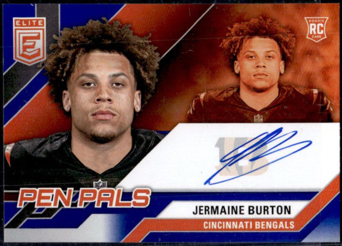 The Jermaine Burton 2024 Elite #PAL-JBU Pen Pals - Blue Ink Rookie card is 1 of 33 Jermaine Burton's card variations in the 2024 Elite set being tracked by Sports Card Investor, including Base Rookie /999, Aspirations (/19), Green Disco, Pink, and Status (/81).