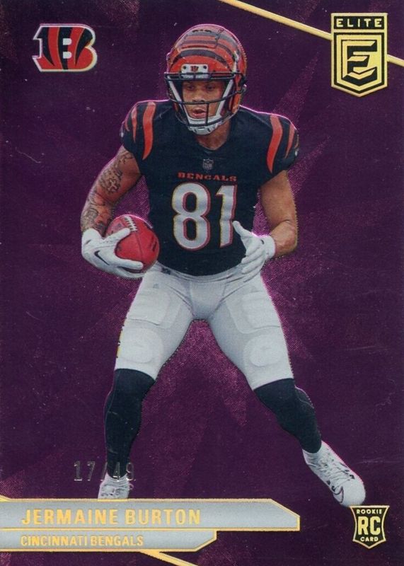 The Jermaine Burton 2024 Elite #176 Purple /49 Rookie card in Raw condition has not changed in price in the last 30 days and was last sold for $5.99 .