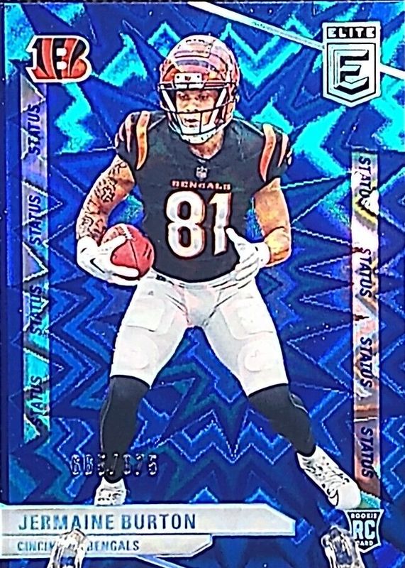 The Jermaine Burton 2024 Elite #176 Status Explosion /875 Rookie card in Raw condition has not changed in price in the last 30 days and was last sold for $1.50 .