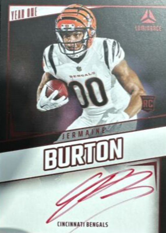 This card is 1 of 4 Jermaine Burton's card variations in the 2024 Luminance set being tracked by Sports Card Investor, including Year One Signatures, Year One Signatures - Green, and Year One Signatures - Purple.
