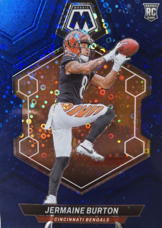 This card is 1 of 41 Jermaine Burton's card variations in the 2024 Mosaic set being tracked by Sports Card Investor, including Base, Green, Mosaic, No Huddle, and Pink Camo.