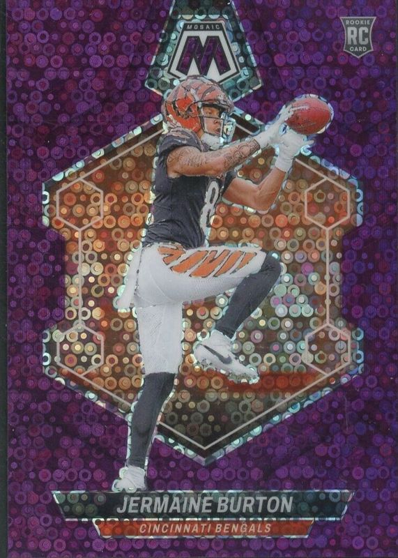 The Jermaine Burton 2024 Mosaic #366 No Huddle Purple /50 Rookie card in Raw condition has not changed in price in the last 30 days and was last sold for $13.99 .