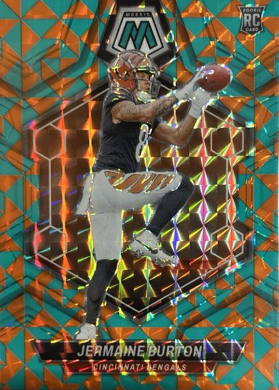 This card is 1 of 41 Jermaine Burton's card variations in the 2024 Mosaic set being tracked by Sports Card Investor, including Base, Green, Mosaic, No Huddle, and Pink Camo.