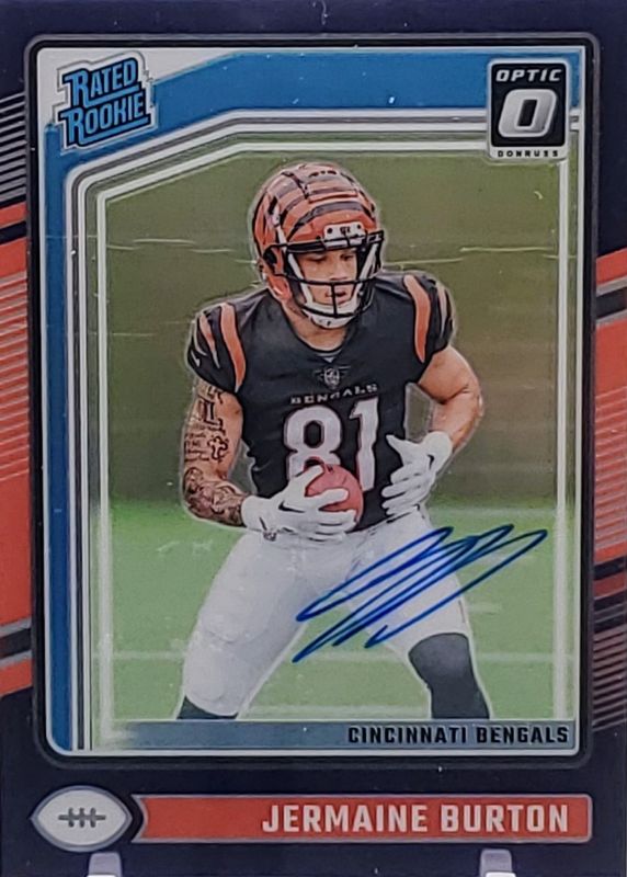 The Jermaine Burton 2024 Optic #251 Rated Rookie Autographs - Purple /35 card in Raw condition has not changed in price in the last 30 days and was last sold for $5.14 .