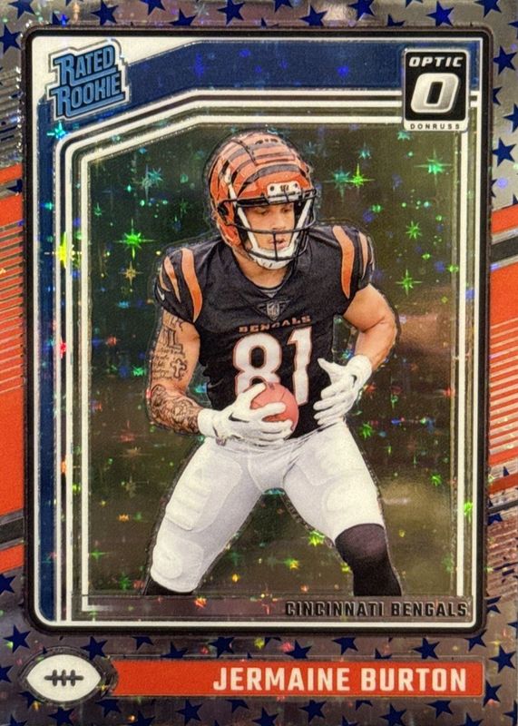 The Jermaine Burton 2024 Optic #251 Stars /(SSP) Rookie card in Raw condition has not changed in price in the last 30 days and was last sold for $1.05 .