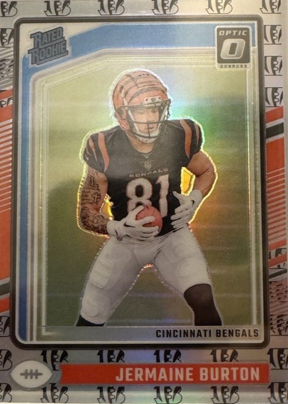 The Jermaine Burton 2024 Optic #251 Team Logo /32 Rookie card in Raw condition has not changed in price in the last 30 days and was last sold for $10.00 .