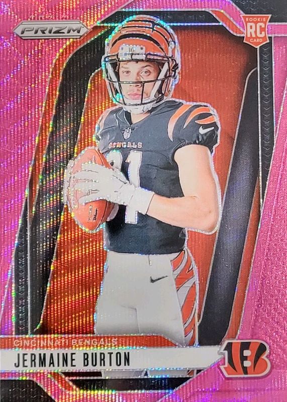 The Jermaine Burton 2024 Prizm #19 Rookie Variation - Pink Wave card in Raw condition has not changed in price in the last 30 days and was last sold for $4.00 .