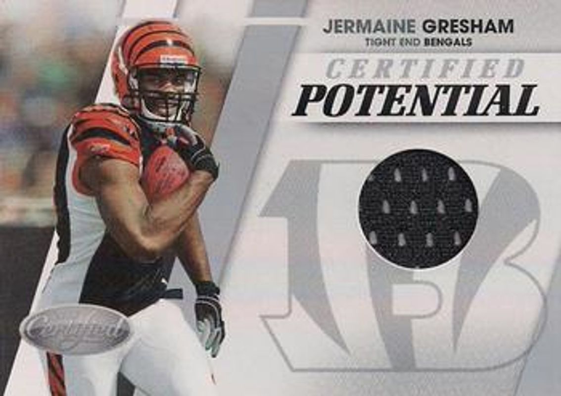 The Jermaine Gresham 2010 Certified #25 Certified Potential Materials /250 Rookie card is 1 of 23 Jermaine Gresham's card variations in the 2010 Certified set being tracked by Sports Card Investor, including Base /299, Mirror Blue /100, Mirror Gold /25, Mirror Emerald /5, and Mirror Black /1.