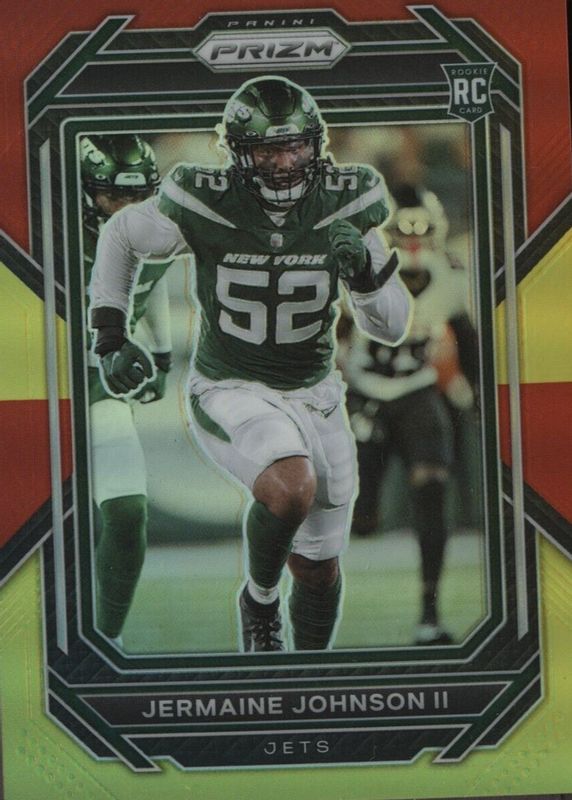 The Jermaine Johnson II 2022 Prizm #375 Red & Yellow (Rookie) /8 card in Raw condition has not changed in price in the last 30 days and was last sold for $95.68 .