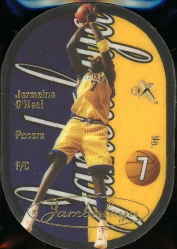 Jermaine O'Neal's Basketball cards are available in at least 140 sets. Jermaine O'Neal's biggest 7-day price movers are 2003 Skybox E-X #9 Jambalaya, 1996 Topps Chrome #191 Refractor, and 1997 Metal Universe #77 Precious Metal Gems Green /10.