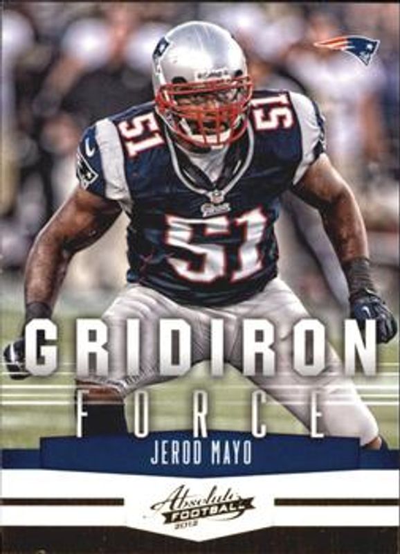 The Jerod Mayo 2012 Absolute #8 Gridiron Force card is 1 of 4 Jerod Mayo's card variations in the 2012 Absolute set being tracked by Sports Card Investor, including Gridiron Force Spectrum /100, Gridiron Force Materials Autographs /25, and Gridiron Force Materials Autographs - Jersey Number /5.