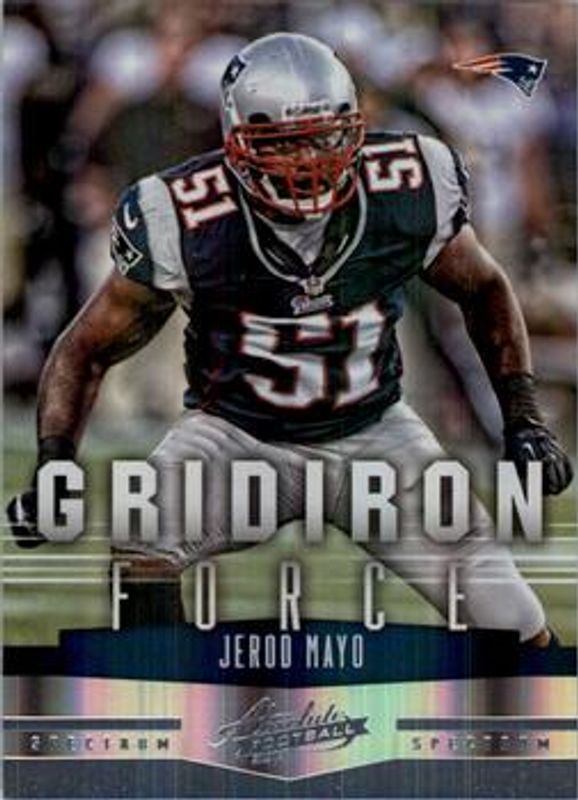 The Jerod Mayo 2012 Absolute #8 Gridiron Force Spectrum /100 card is 1 of 4 Jerod Mayo's card variations in the 2012 Absolute set being tracked by Sports Card Investor, including Gridiron Force, Gridiron Force Materials Autographs /25, and Gridiron Force Materials Autographs - Jersey Number /5.