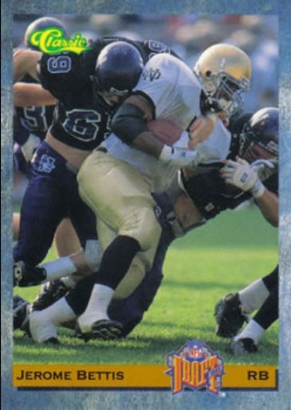 The Jerome Bettis 1993 Classic #10 Base Rookie card is 1 of 4 Jerome Bettis' card variations in the 1993 Classic set being tracked by Sports Card Investor, including Gold, Draft Stars, and Limited Prints.
