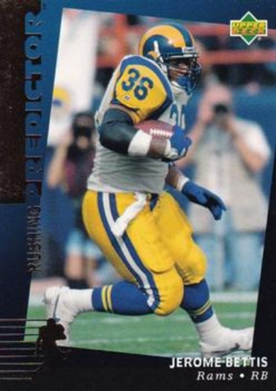 The Jerome Bettis 1994 Upper Deck #RP13 Predictors: League Leaders card is 1 of 9 Jerome Bettis' card variations in the 1994 Upper Deck set being tracked by Sports Card Investor, including Base, Electric, Electric Gold, Predictors: Award Winners, and Predictors Exchange: Award Winners.