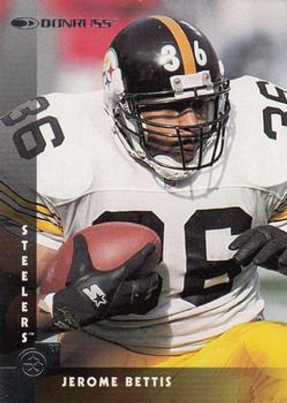 The Jerome Bettis 1997 Donruss #30 Base card is 1 of 6 Jerome Bettis' card variations in the 1997 Donruss set being tracked by Sports Card Investor, including Press Proof Gold Die-Cut, Press Proof Silver, Elite /5000, Zoning Commission /5000, and Elite - Gold /2000.