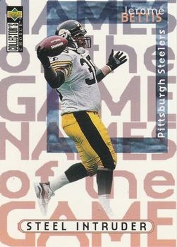 The Jerome Bettis 1997 Upper Deck Collector's Choice #85 Base card is 1 of 12 Jerome Bettis' card variations in the 1997 Upper Deck Collector's Choice set being tracked by Sports Card Investor, including Base, Jumbos 5x7, Mini Standee, Names of the Game 3x5, and Names of the Game 5x7.