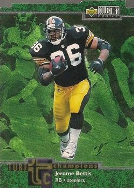 The Jerome Bettis 1997 Upper Deck Collector's Choice #TC76 Turf Champions card is 1 of 12 Jerome Bettis' card variations in the 1997 Upper Deck Collector's Choice set being tracked by Sports Card Investor, including #85 Base, #289 Base, #4 Jumbos 5x7, #ST29 Mini Standee, and #4 Names of the Game 3x5.