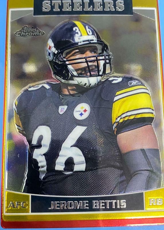 This card is 1 of 10 Jerome Bettis' card variations in the 2006 Topps Chrome set being tracked by Sports Card Investor, including Base, Printing Plates Black /1, Printing Plates Cyan /1, Printing Plates Magenta /1, and Printing Plates Yellow /1.