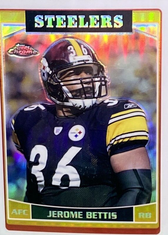 This card is 1 of 10 Jerome Bettis' card variations in the 2006 Topps Chrome set being tracked by Sports Card Investor, including Base, Printing Plates Black /1, Printing Plates Cyan /1, Printing Plates Magenta /1, and Printing Plates Yellow /1.
