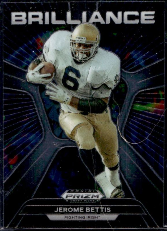 The Jerome Bettis 2024 Prizm Draft Picks #BR-JBS Brilliance card is 1 of 8 Jerome Bettis' card variations in the 2024 Prizm Draft Picks set being tracked by Sports Card Investor, including Brilliance - Blue Ice /99, Brilliance - White Sparkle /(SSP), Brilliance - Orange Pulsar /49, Brilliance - Mojo /25, and Brilliance - Gold /10.